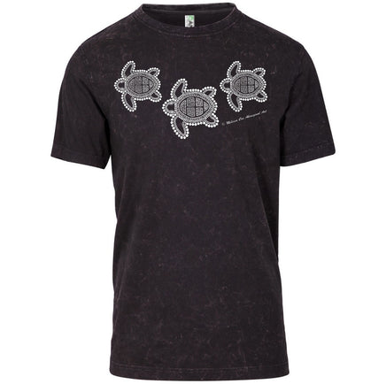 This premium dye Aboriginal art t-shirt is called Sea Turtles and features a series of 3 turtles across the chest of the shortsleeve stonewash t-shirt. The original art we are reproducing is by Bathurst artist Meleisa Cox, a self-taught Wiradjuri artist working in a contemporary style. This Sea Turtles design is available in this specialty dye black stonewash tee, which is soft to touch and is available in sizes up to 5XL.