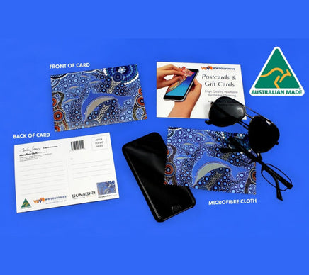 A simple, yet useful gift item from Australia, here we have Colin Jones Aboriginal art design Dolphin on a microfibre cloth, encased in a postcard you can send to a friend or relative. A colourful Aboriginal art design with a function, you can use it to safely clean your glasses, phone or any similar surface.