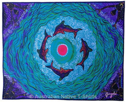This screen printed panel is called Dolphins Dreaming, an Aboriginal art design that is finely detailed in dark blue, aqua and purple tones. It has rainbow dolphins circling the middle of the print with an indigenous person in each corner with arms reaching up. A bright and vibrant design - a wonderful wallhanging for your home or office. This Panel Print Measures: 42cm x 51cm (16.8 Inch x 20 Inch). Original art being reproduced here is by Indigenous artist, Melissa Craig "Jingalu".