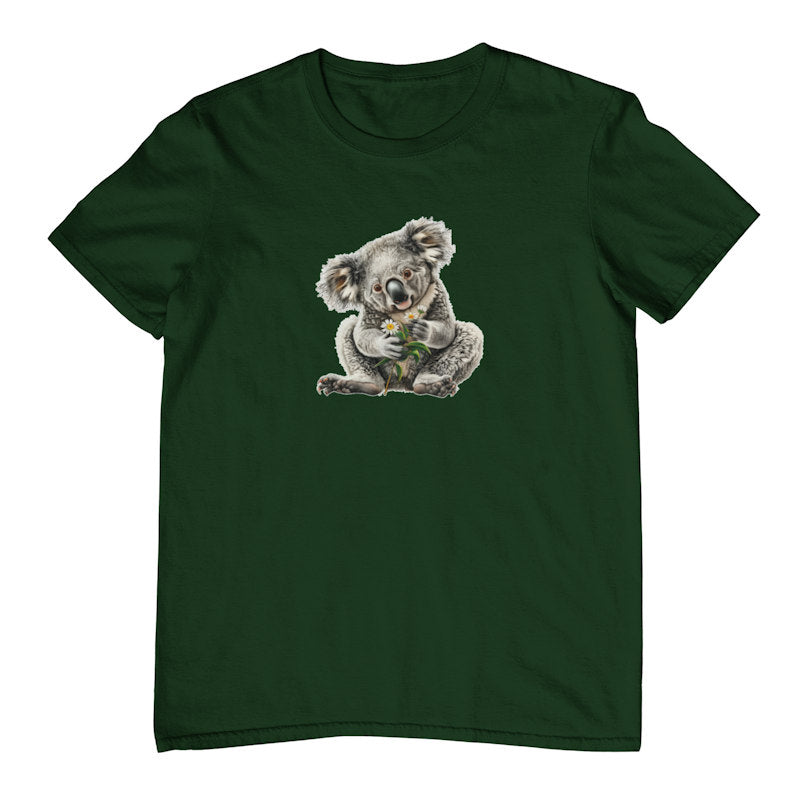 This t-shirt features a Koala sitting and holding some Daisies! A lovely piece of art featuring one of our most precious Australian animals. This cute Koala t-shirt is from our very own Australian Native T-Shirts range and is available in your choice of colour and size (note: our sizing is generous and loose fit).