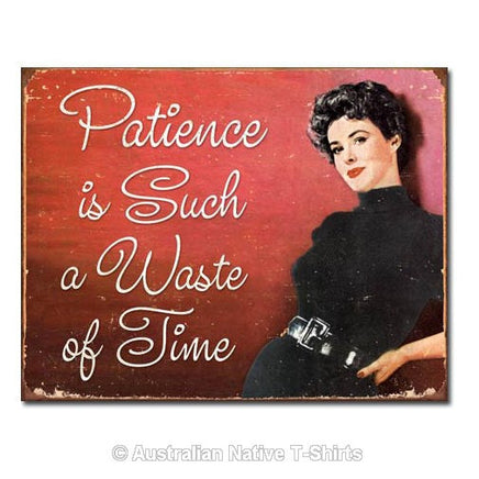 A novelty gift of a tin sign, give this to anyone who has the same attitude.. Patience is such a waste of time. A cool retro style design with an old, rusted appearance, it comes pre-drilled and ready for display.