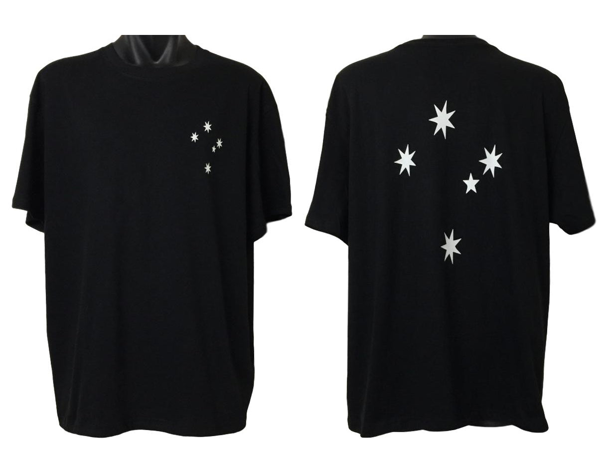 This double sided Southern Cross t-shirt has the stars of the cross on the front left chest in a small size and a much larger Southern Cross on the back of the shirt. It's a black 100% cotton tee and it comes from BigTees Australia.