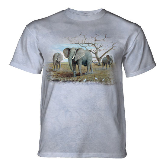 This childrens t-shirt is called Three African Elephants and is part of The Mountain 2021 Collection of wildlife designs. It's a blue-ish tie dye shortsleeve kids size t-shirt, available in a range of childrens sizes. A lovely t-shirt for anyone who loves elephants, especially in a natural setting.