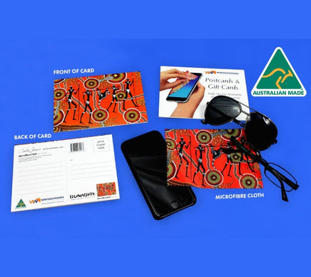 A simple, yet useful gift item from Australia, here we have Colin Jones Aboriginal art design Hunter & Gatherer Land on a microfibre cloth, encased in a postcard you can send to a friend or relative. A colourful Aboriginal art design with a function, you can use it to safely clean your glasses, phone or any similar surface.