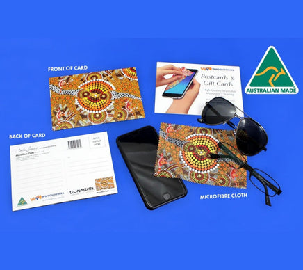 A simple, yet useful gift item from Australia, here we have Colin Jones Aboriginal art design Dot Ochre on a microfibre cloth, encased in a postcard you can send to a friend or relative. A unique Aboriginal art design with a function, you can use it to safely clean your glasses, phone or any similar surface.