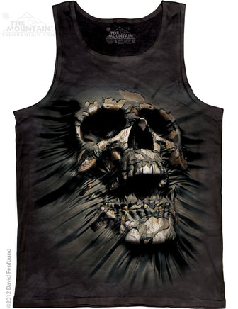 This singlet is called Breakthrough Skull and features an almost 3D design of a skull ripping through your top. It's printed on a dark tie dye background and is available here in adult size Medium.