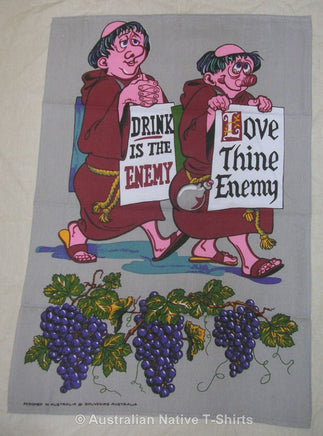 This retro design features a pair of Monks in a comic design with one Monk holding a sign that says: Drink is Thine Enemy and the other (very drunk) Monk is holding a sign that says: Love Thine Enemy. A fun design that has been around for decades, printed on a 100% cotton tea towel.
