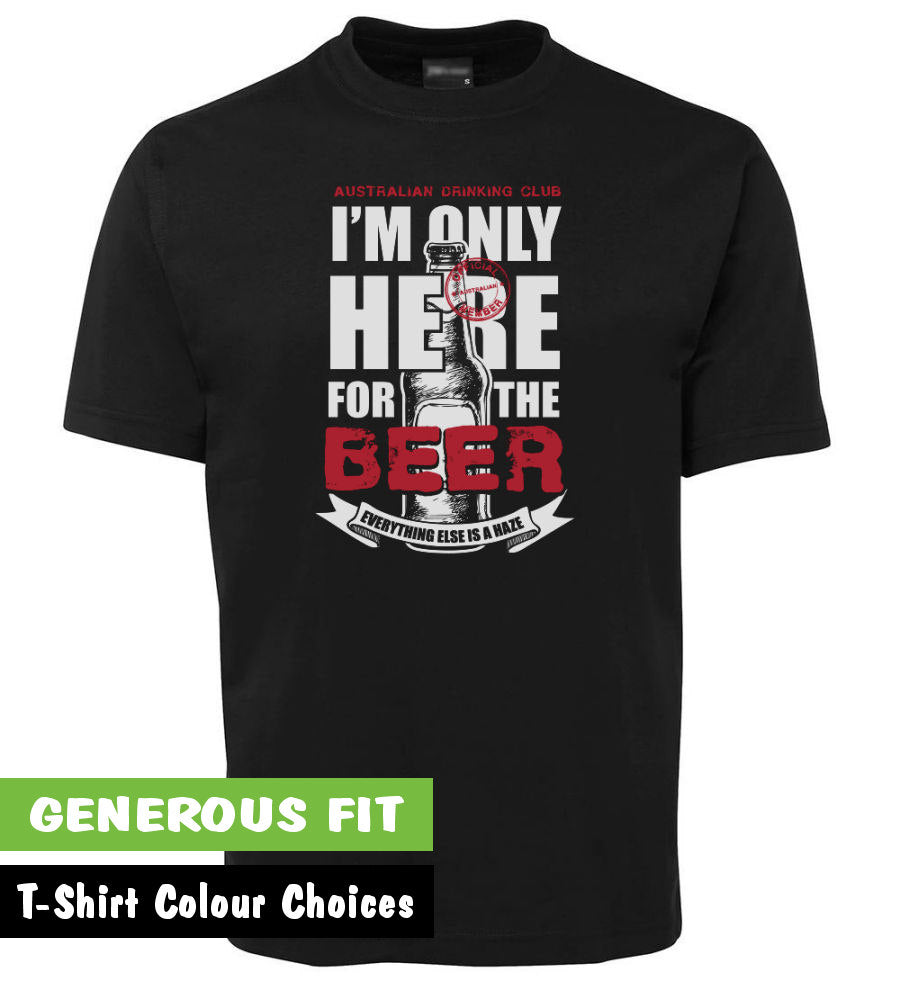 This t-shirt is part of our Aussie Beer Drinkers Club range and features a design that says "I'm Only Here for The Beer", followed by "Everything Else is a Haze". It's available in a wide range of adult sizes for the devoted Aussie beer drinker in two great colours, jr navy or black! Available in our own range of generous fitting sizes up to Australian 5XL.