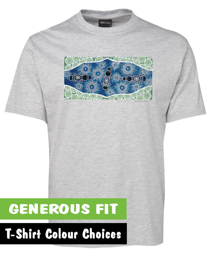 This Aboriginal art t-shirt is called Down by the River and features several platypus swimming in the river, with the green banks either side. The original art we are reproducing is by Bathurst artist Meleisa Cox, a self-taught Wiradjuri artist working in a contemporary style. This dot art Platypus design is available on various coloured t-shirts including snow grey, black, jr navy, indigo and a bone colour and comes in adult sizes up to a generous fitting 5XL.